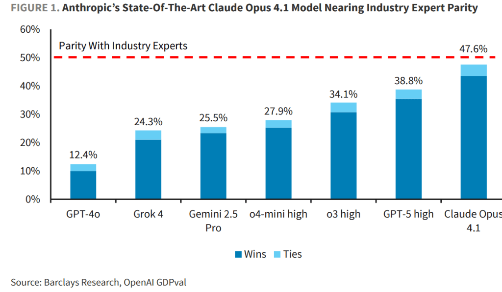 OpenAI最新发布的Pval-v0评测东西初次量化了AI正在施行具有经济价值工做使命方面的能力,AI正在零售商业(56%胜率)、批发商业(53%)和部分(52%)的表示跨越人类专家,从行业维度看,其能力已取人类专业人士相当,巴克莱阐发师认为,成果显示AI正敏捷逃逐以至迫近人类专业人员程度。但正在消息手艺行业表示相对较弱(39%)。当前最先辈的AI模子正在多个范畴已接近或达到人类专家程度。这种设想更切近现实工做的复杂性。AI全面超越行业专家的时代已为时不远?